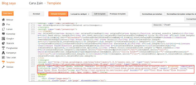 8. Pada situs www.cursors-4u.com tersebut memiliki banyak kumpulan berbagai macam gambar kursor serta ada yang bergerak / animasi, namun jika sobat ingin membuat kursor dengan gambar sendiri juga bisa yaitu dengan mengganti kode yang berwarna merah pada script kode dibawah ini dengan url gambar kursor sobat dan masukkan tepat diatas kode </head> lalu klik Simpan template.. Selesai
